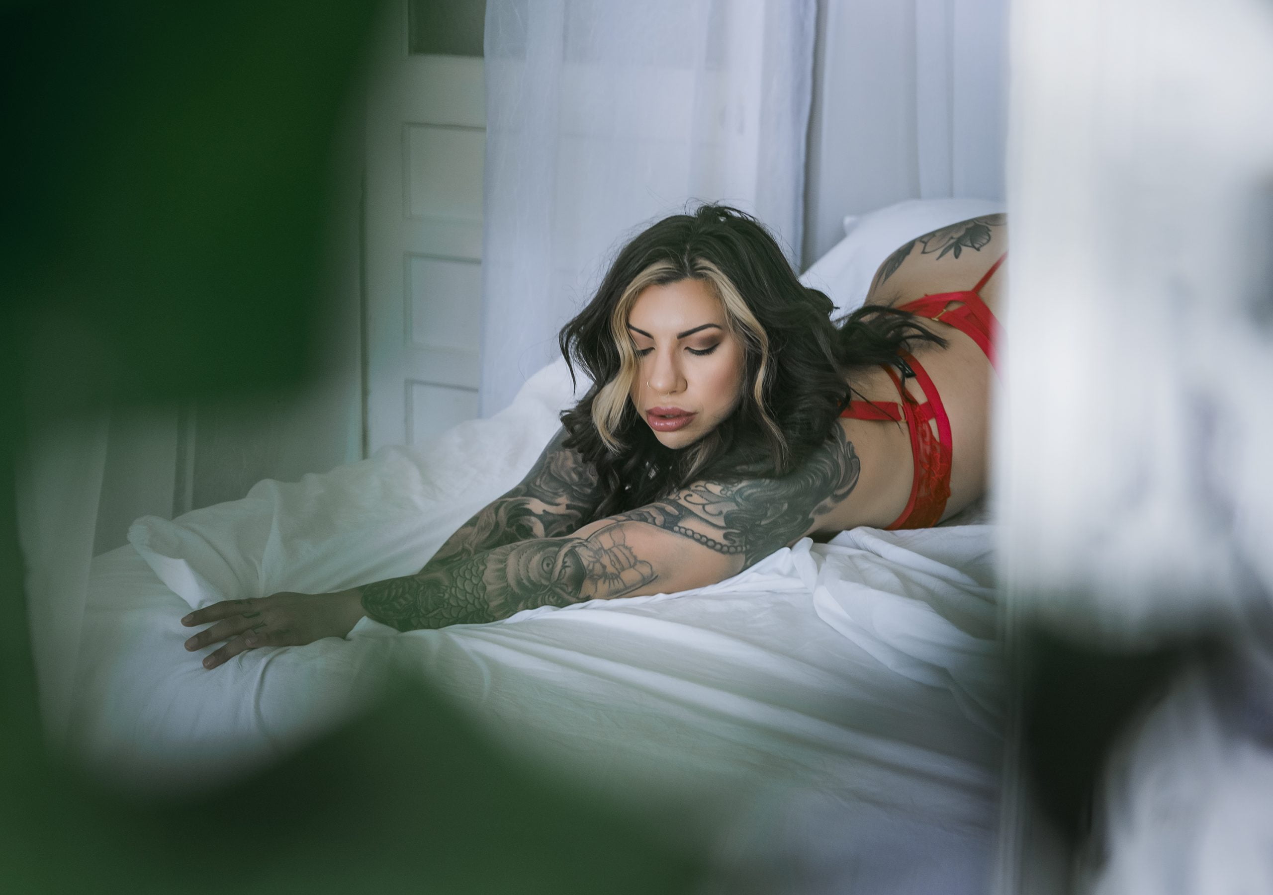 Shawn’s comments “The foreground elements that obstruct the view offer a voyeuristic feel to this image which pairs well with her expression and pose. The lighting is nice where here face is the focus, but it all displays her ink nicely.”